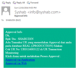 Salah satu feature dari approval ini juga system ada notifikasi via email, sehingga user mengetahui via email saat ada transaksi yang membutuhkan approval